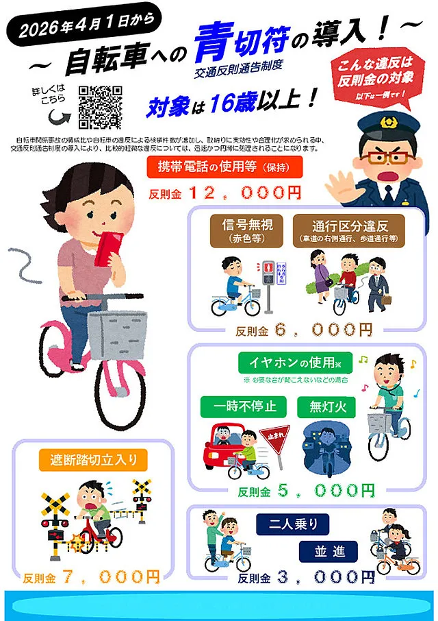 2026年4月からは、改正道路交通法の施行により、16歳以上の自転車利用者に対して「青切符(交通反則通告制度)」が適用されることが決定。